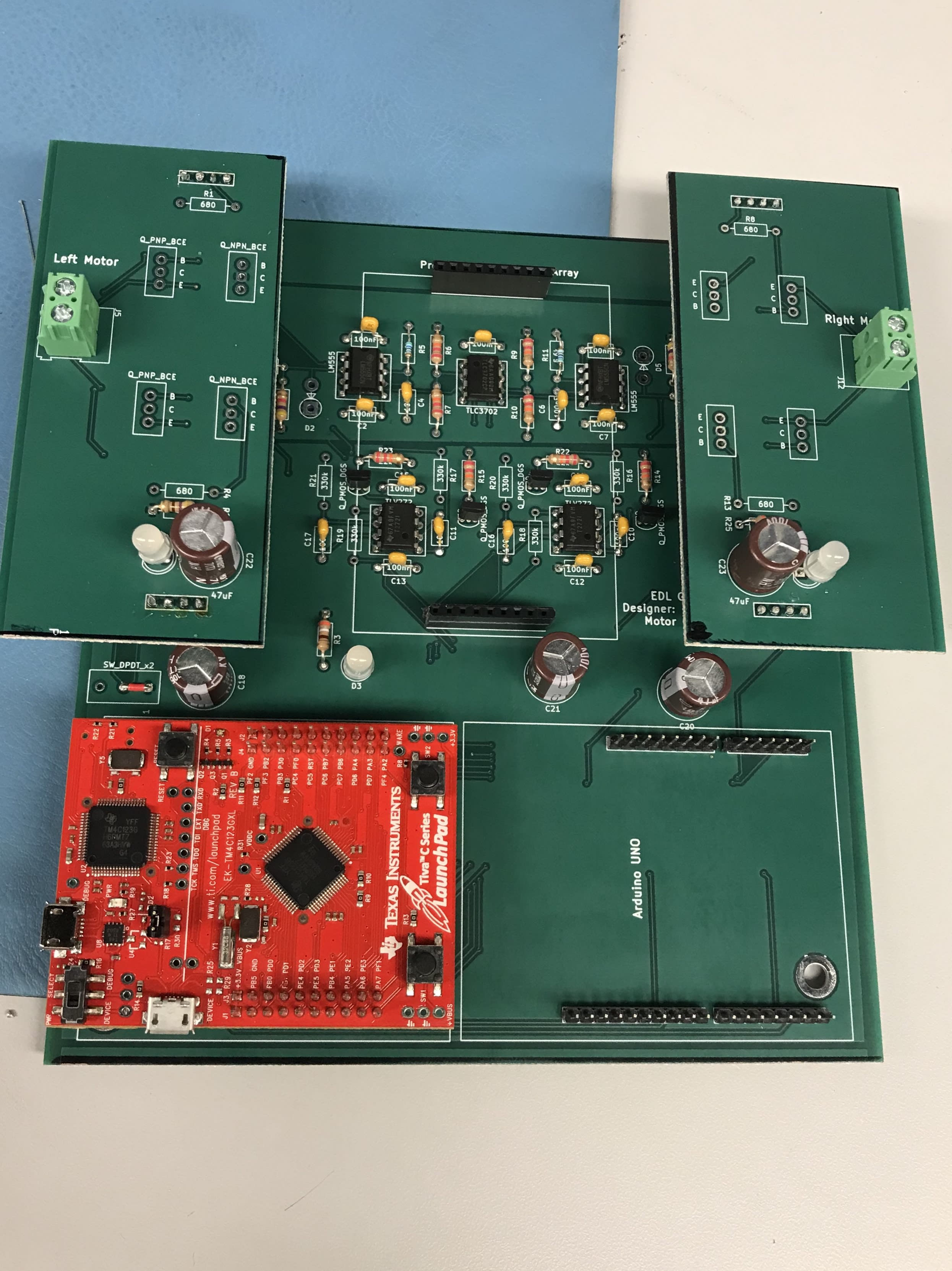 I designed the PCB in KiCad to house the analog control circuit, motor drivers, and two microcontrollers (the basic Arduino Uno which the class was using and a more advanced Tiva C Series which I wanted to use). I also decided to make using the Tiva C Series even cooler by installing a real-time operating system on it, FreeRTOS.